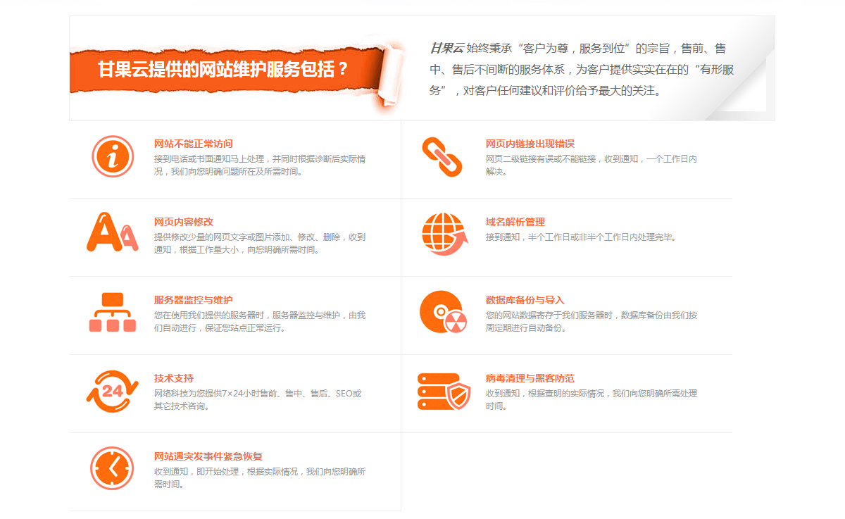 甘果云建站平台始终秉承“客户为尊,服务到位”的宗旨,售前、售中、售后不间断的服务体系,为客户提供实实在在的“有形服务”,对客户任何建议和评价给予及时关注。